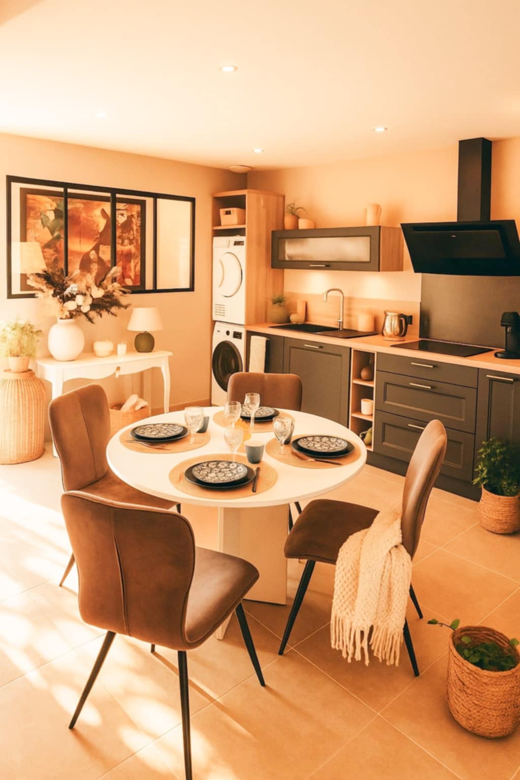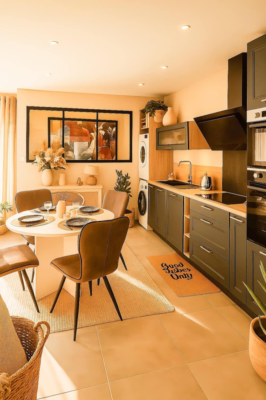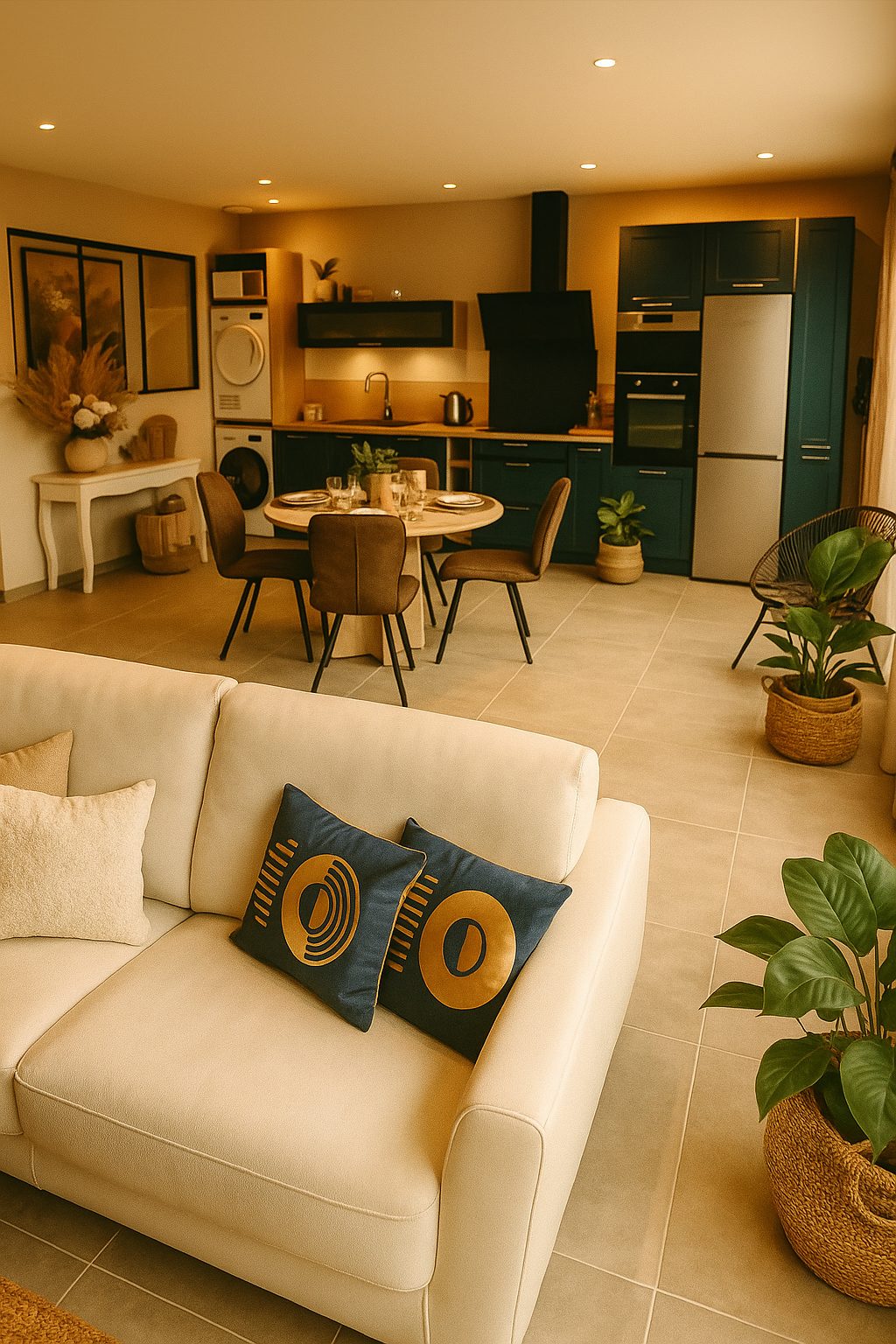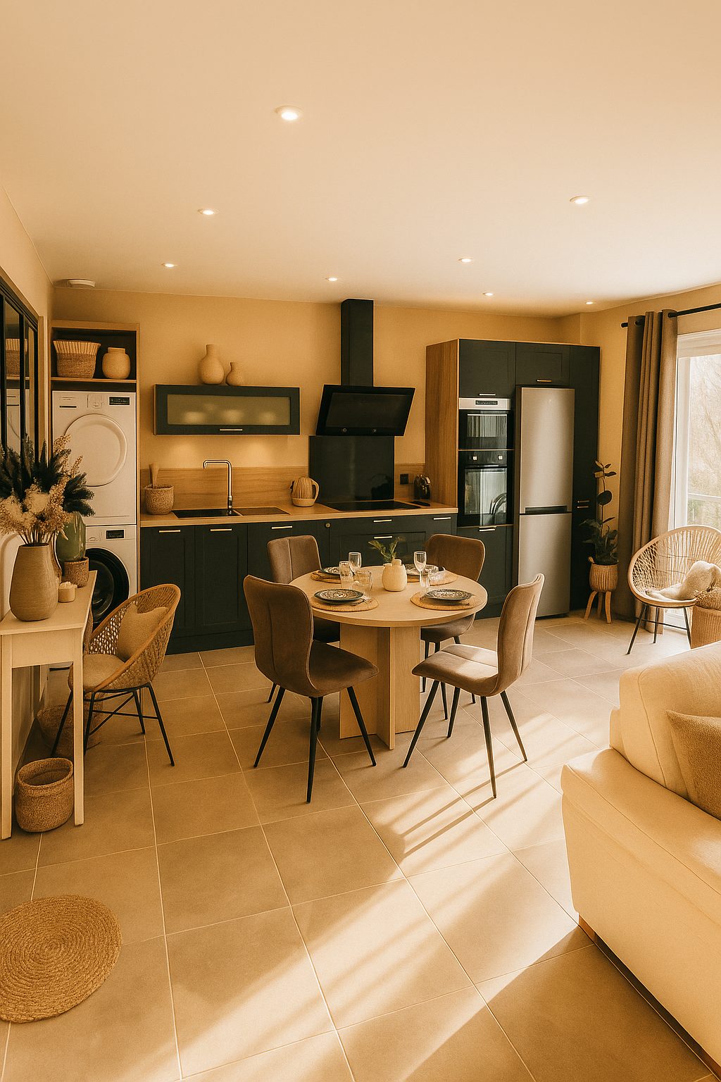 -une cuisine entièrement équipée lave-vaisselle, machine à laver, sèche-linge et réfrigérateur-congélateur.
