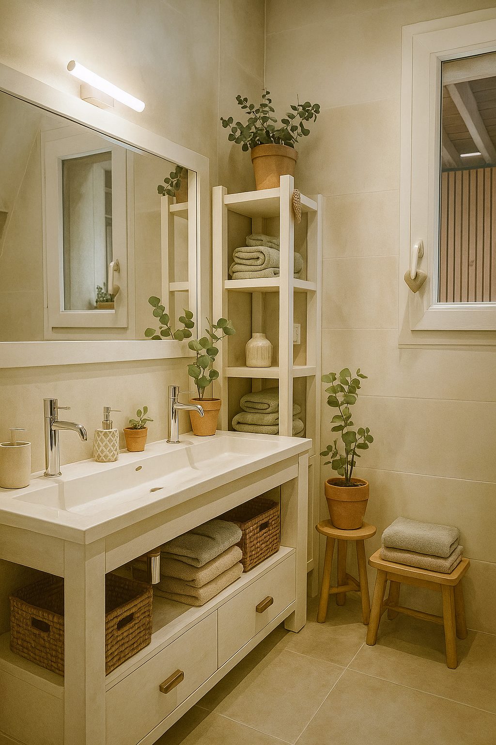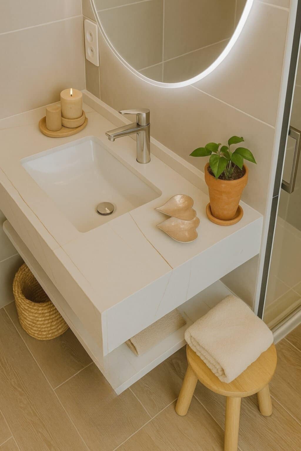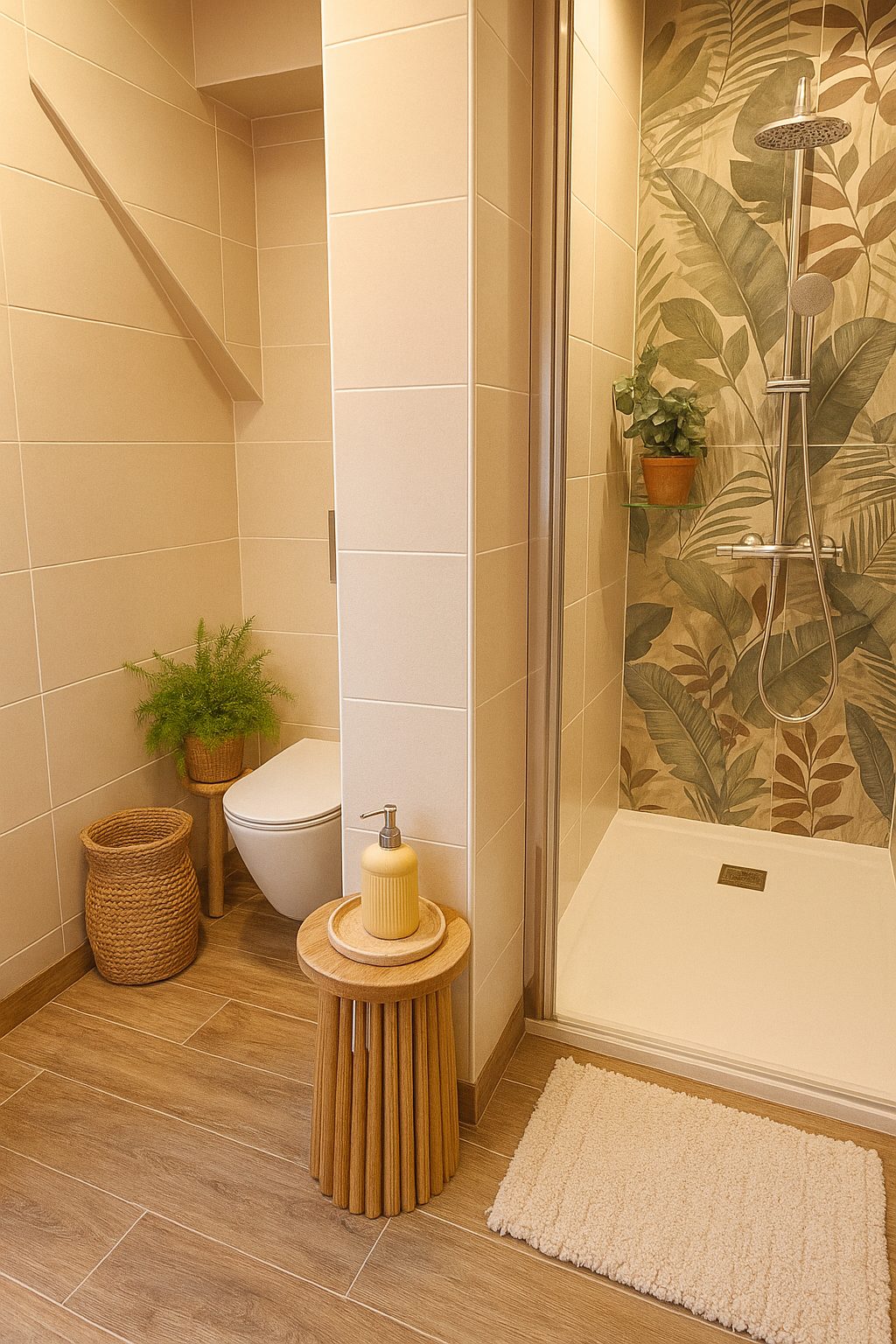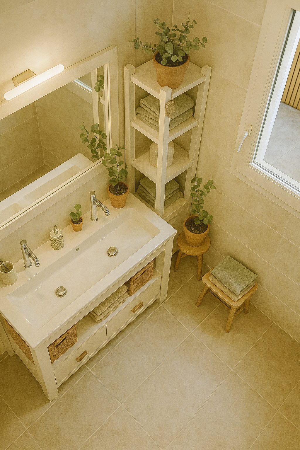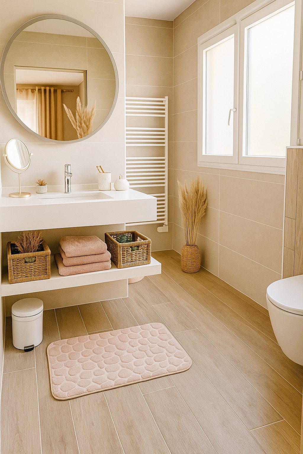 Salle de bains moderne avec douche à l’italienne, lavabo, sèche-serviettes et sèche-cheveux.