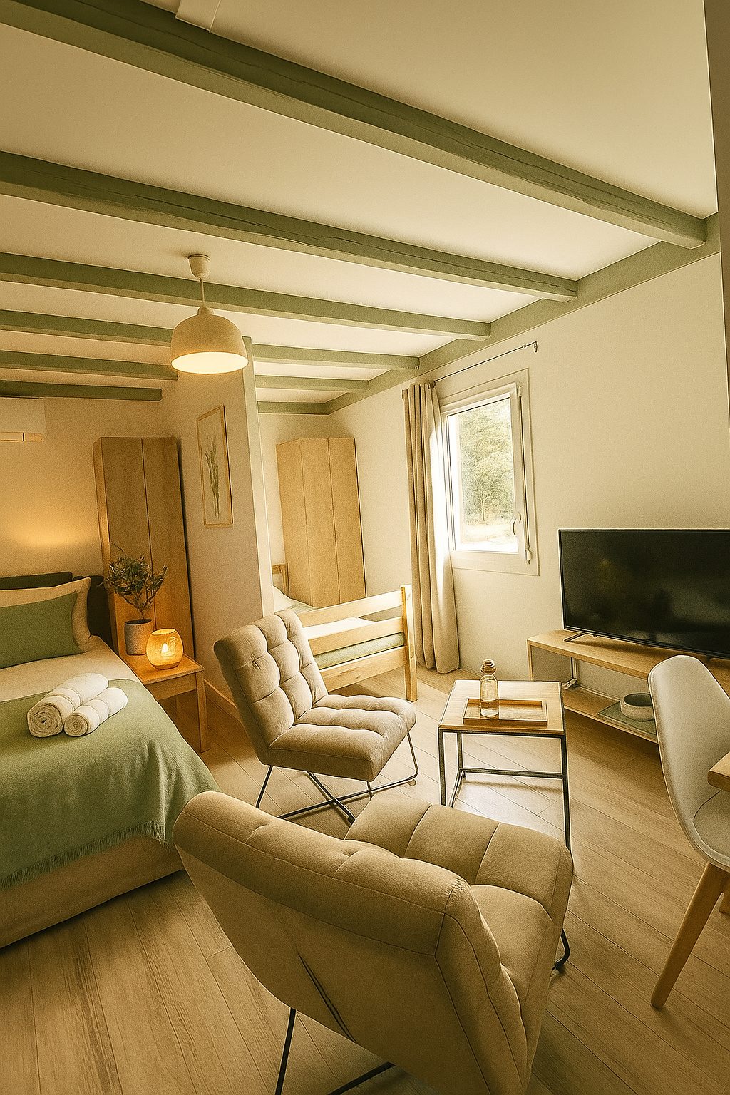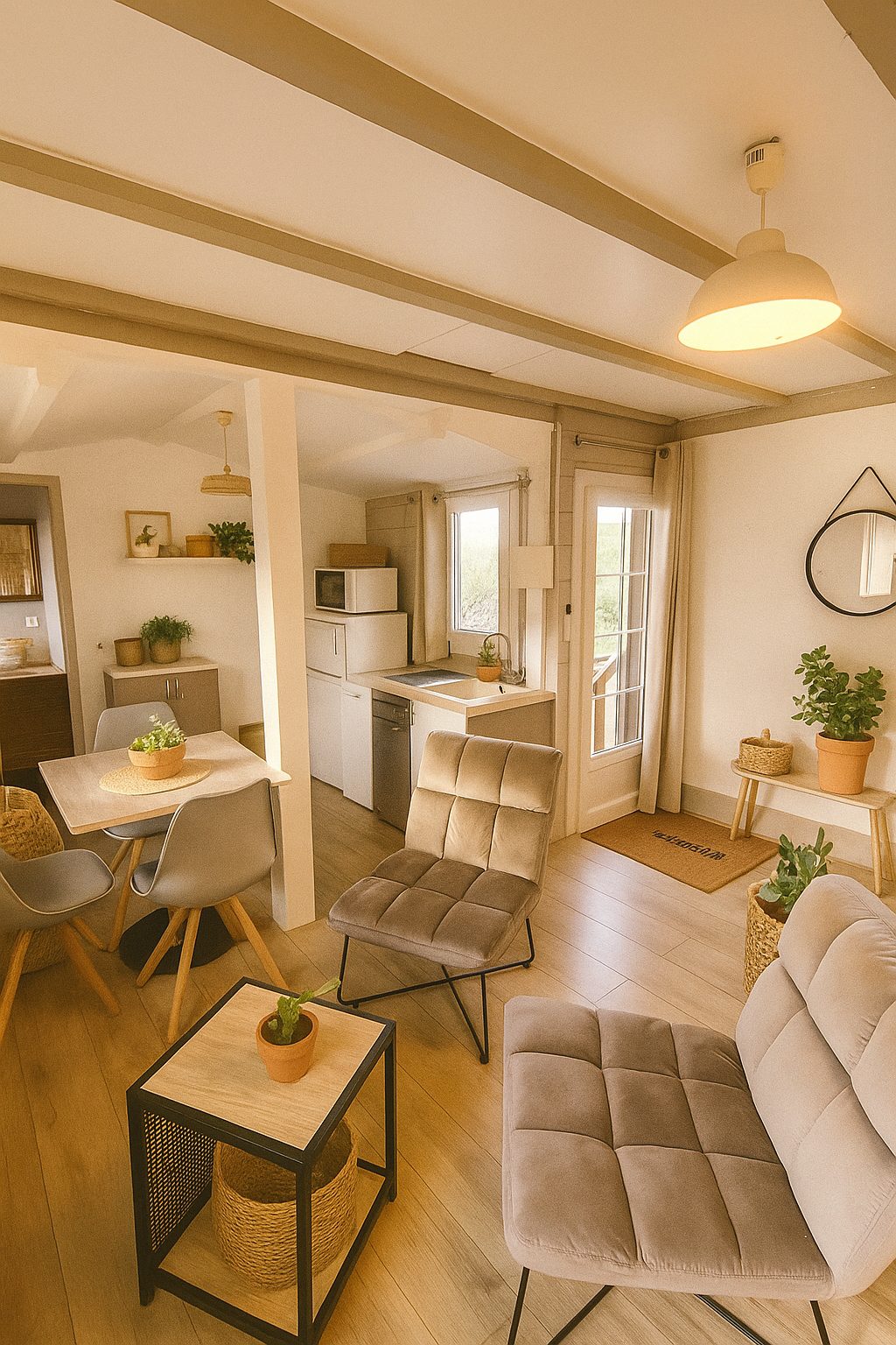 Il peut accueillir trois personnes maximum, car il est équipé d’un lit double en 140 x 190 et d’un lit simple de 90 x 190. Cependant, le linge de lit est en supplément en cas de location à la semaine et si vous choisissez cette option, les lits sont prêts à votre arrivée.