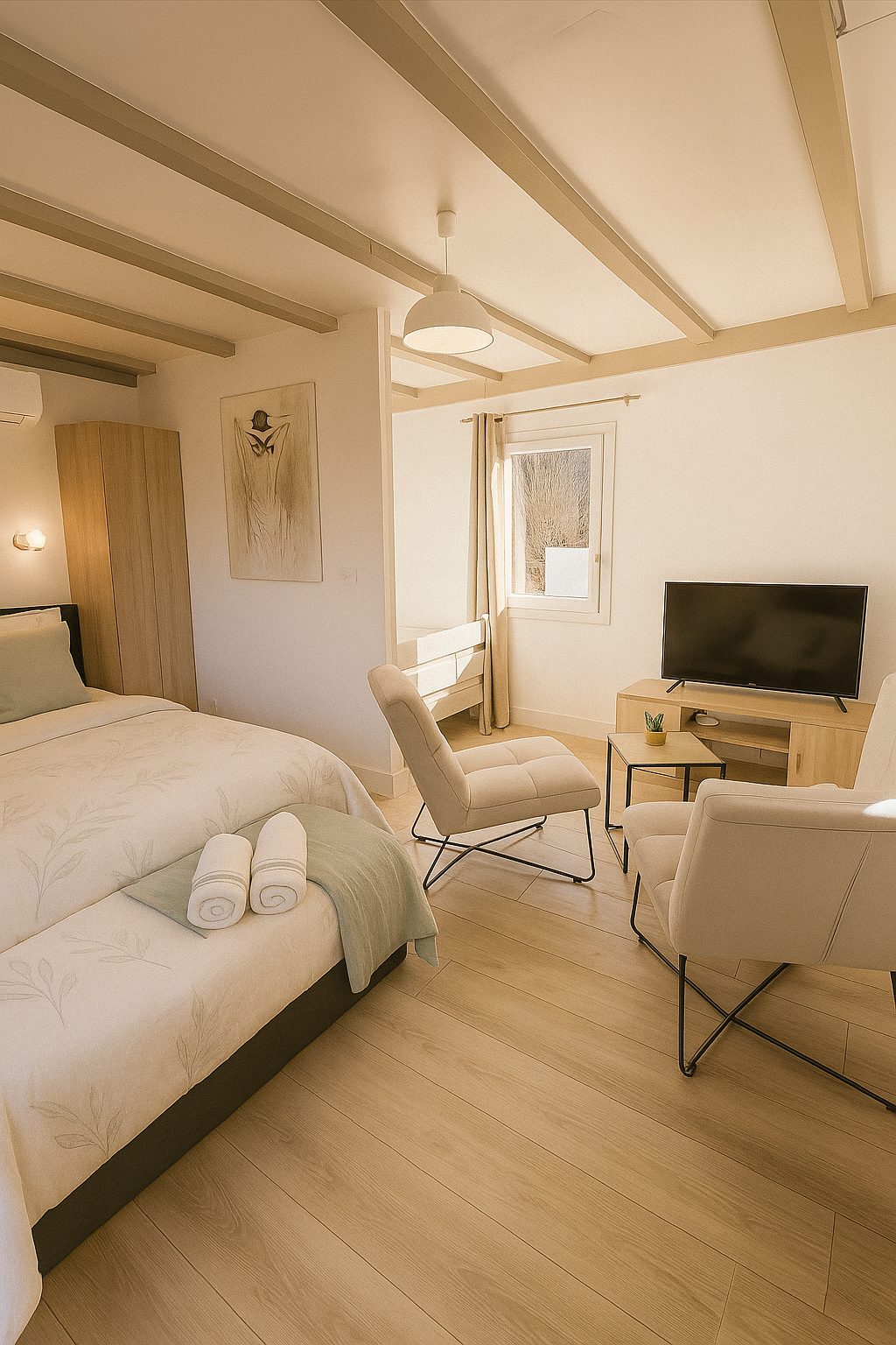 Ce studio meublé climatisé est situé au premier étage par une entrée indépendante de la maison et donc, vous assure une autonomie complète.